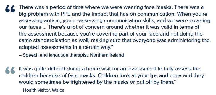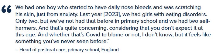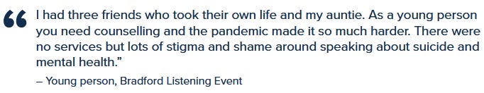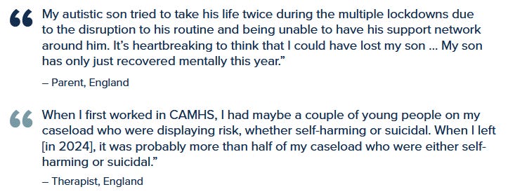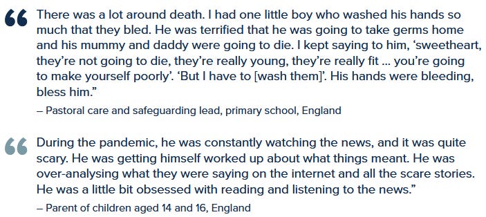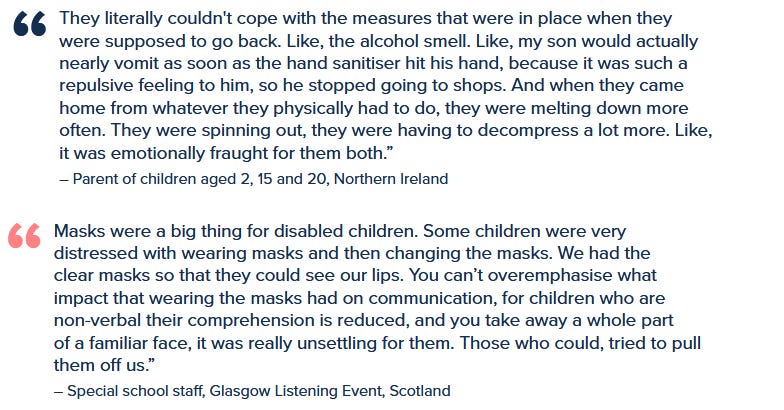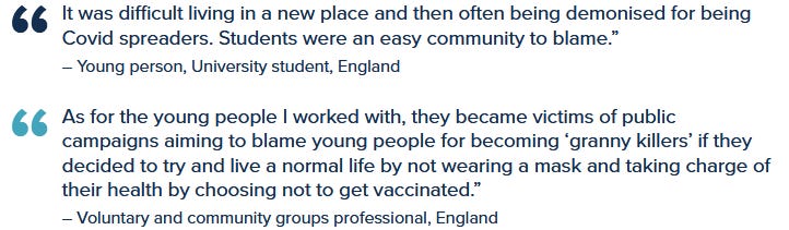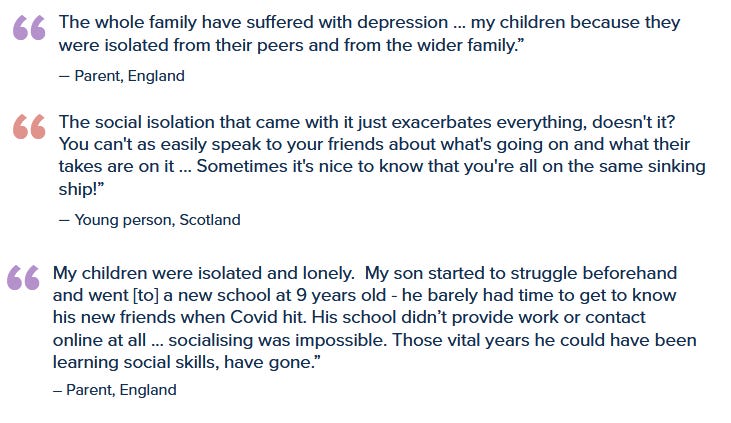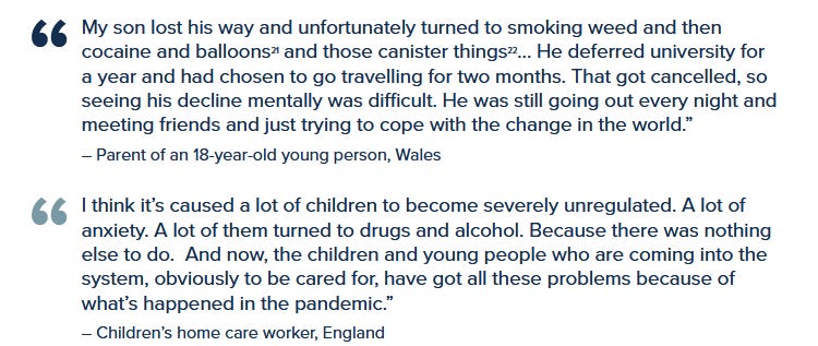 Mask harms, isolation harms, mental health issues, suicidal ideation, eating disorders, reduced immunity to disease and excessive drug use common themes.