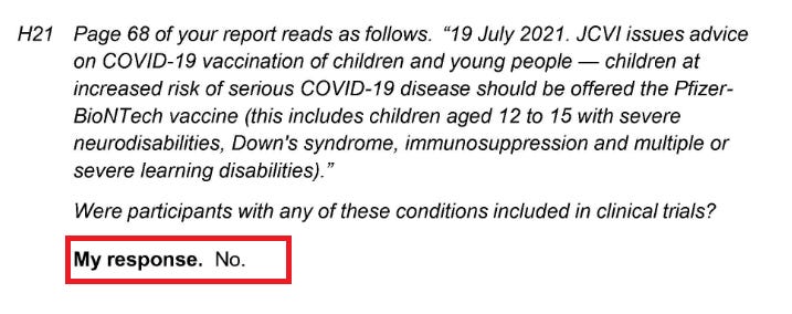 Furthermore children aged 12 to 15 with severe neurodisabilities, down's syndrome, immunosuppression and multiple or severe learning disabilities were recommended the Pfizer injection despite particpiants with these conditions excluded from the clinical trials!