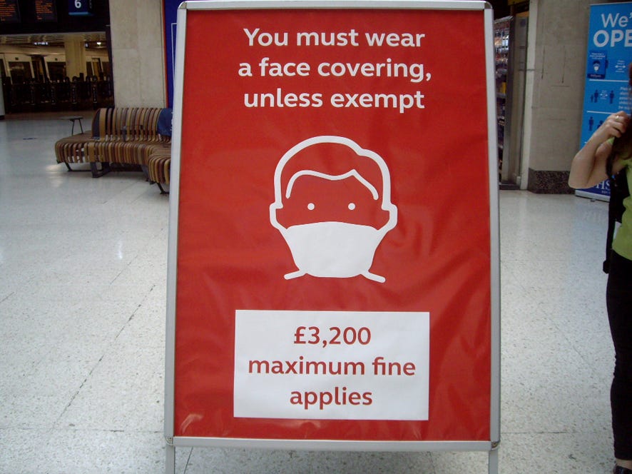 ‘Photograph in September 2020 inside the entrance of Charing Cross railway station (which is both overhead and underground). The sign which ordered “You must wear a face covering, unless exempt £3,200 maximum fine applies”.