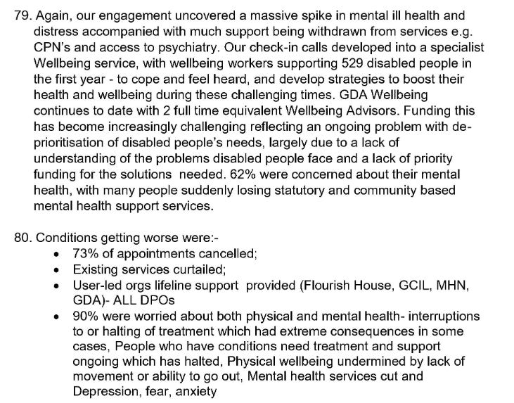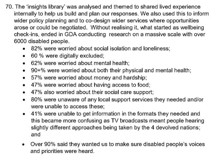 ‘‘It emerged IMMEDIATELY because disabled people are twice as likely to be socially isolated. They are also disproportionately reliant on (healthcare) services and those services ALL STOPPED.’’