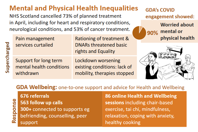 ‘‘For many years, members of GDA have described feeling a sense of de-prioritisation and dehumanisation and this unfortunately continued during Covid in many ways including specific Emergency Legislation outlined in the Coronavirus Scotland Act. This Act allowed Local Authorities to relax certainduties and to prioritise urgent services…