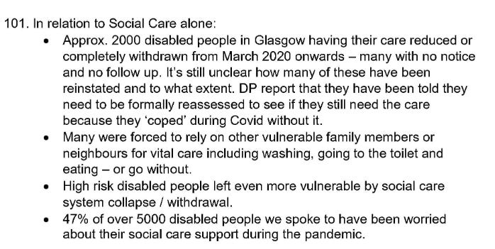‘‘In Glasgow, almost 2000 care packages were cut from March 2020 onwards, leaving many disabled people even MORE vulnerable. Many of our members were left with no support to wash, eat, go to the toilet and take medications.’’