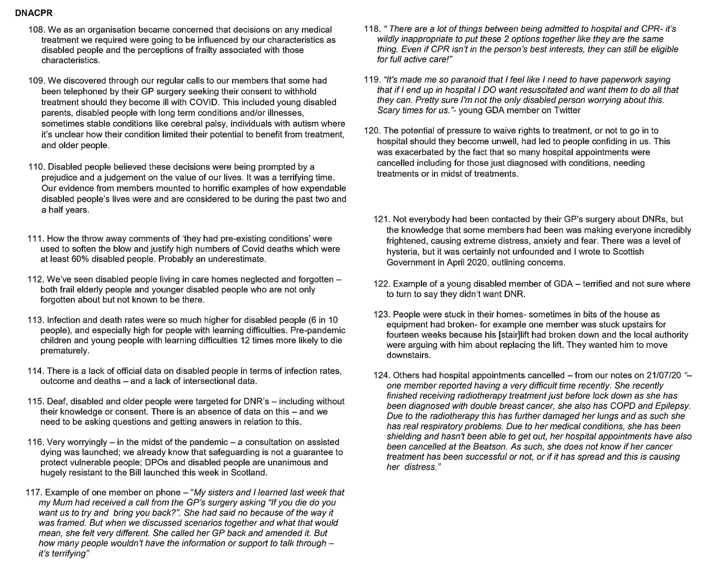 As our most vulnerable members of society were being crushed by lockdown policies simultaneously coersive DNRs were being offered by GPs and applied in hospitals without consent or any informed discussions with families. People with mere deafness were applied DNACPR notices. Many GDA members are also neither frail or elderly.
